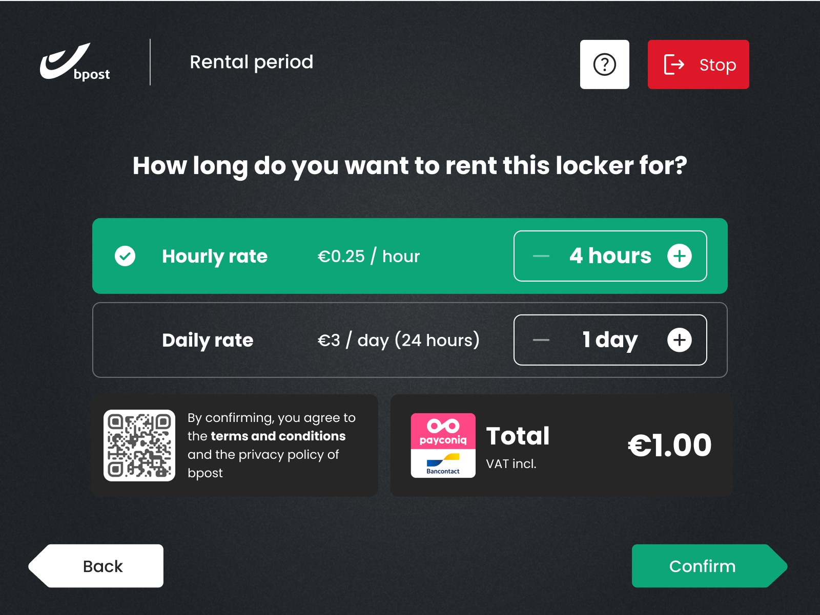 Scan the QR code from your email, pay with Payconiq by Bancontact, and the locker door will open.